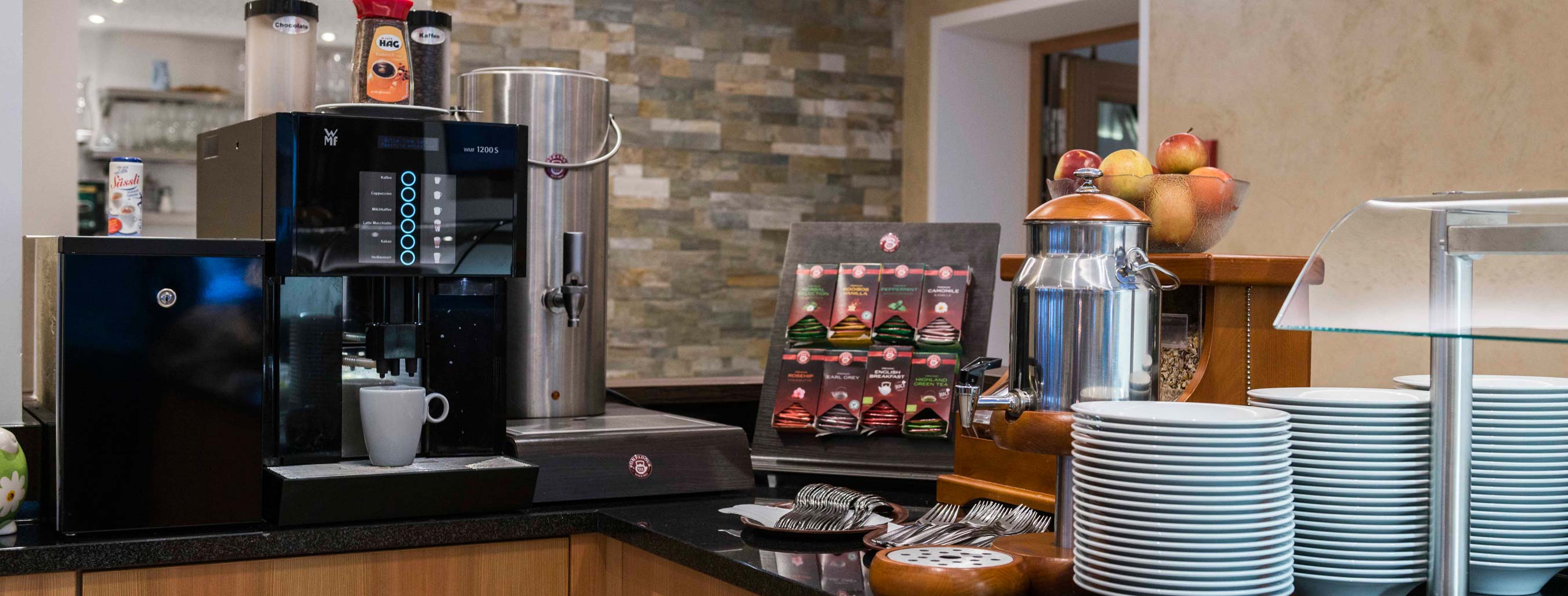 Espresso Qualität aus unserem Vollautomaten – zu bedienen kinderleicht, die Auswahl fantastisch, die Bohnenqualität überwältigend – genauso möchten wir uns präsentieren. Für Liebhaber des „leichteren“ Filterkaffees zum Frühstück steht Ihnen in Thermoskannen Jacobs Krönung Filterkaffee zur Verfügung.
